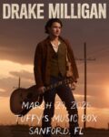 Drake Milligan – Sanford When March 29, 2026 8:00 pm Add To Calendar Download ICS Google Calendar iCalendar Office 365 Outlook Live Where Tuffy's Music Box 200 Myrtle Ave, Sanford, FL, 32771 Event Type Concerts